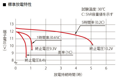 バッテリーの容量は放電電流の大きさによって変化します。例えば5時間率放電容量が100Ahのバッテリーの1時間率放電容量は65Ahになります。 |