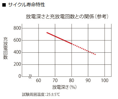 小型電動車用制御弁式鉛蓄電池の寿命は、実際の電池の5時間率容量が定格容量の80%以下に至った時と規定されています。これを超えて使用を続けると電池内部部品の劣化によって、急な放電停止、変形、破損の原因となります。充放電回数は、左記を参考にしてください。 |