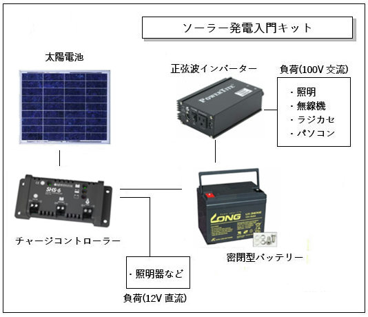 ソーラー発電入門キットは、太陽電池、充電・放電コントローラー、インバーター、メンテナンスフリー蓄電池等をセットにした簡単な太陽電池 システムです。